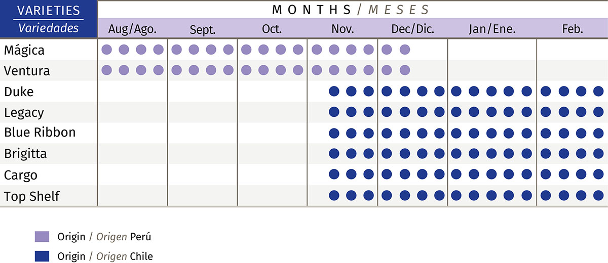Nativo de América del Norte, este arbusto fructifica en bayas de característico color azul. Nuestros arándanos se cultivan la zona centro-sur y sur de Chile y en la zona norte de Perú y se diferencian de otros por su sabor, firmeza y cobertura de color y pruina. Los arándanos son una fuente natural y abundante de anti-oxidantes lo cual sumado a sus excelentes cualidades organolépticas lo transforman en un excelente y muy saludable alimento.